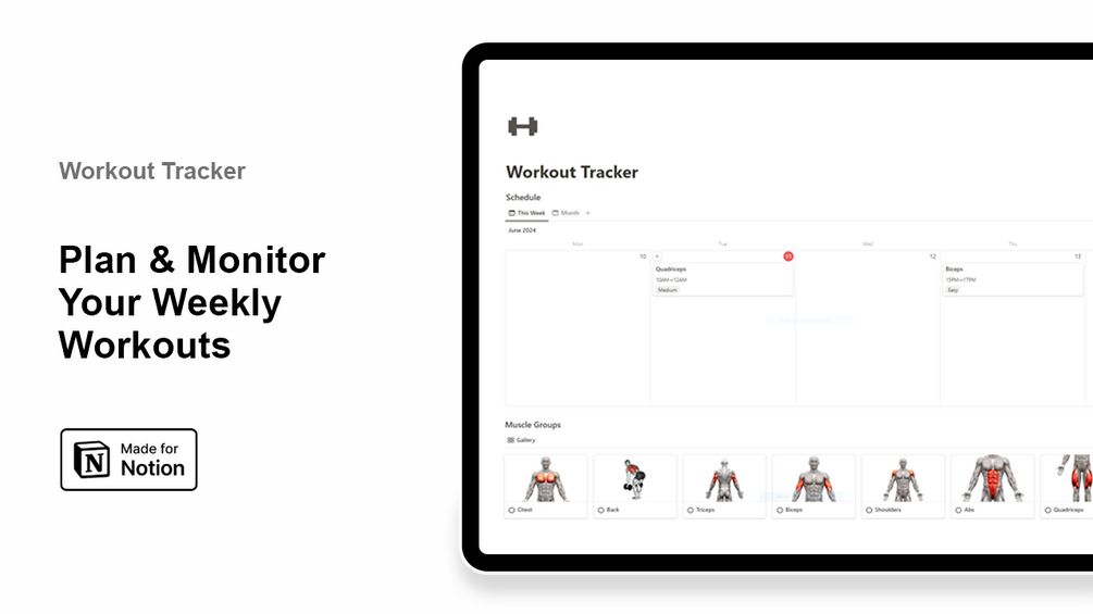This Notion template lets you add as many exercises as you want, grouped by different muscle groups, so you can easily plan your workout routine.
